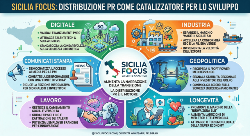 Di seguito un’analisi completa di come la distribuzione strategica dei comunicati stampa rappresenti il principale motore di sviluppo nei sei pilastri di Sicilia Focus.