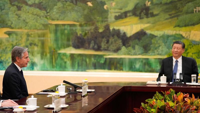 Il presidente cinese Xi Jinping parla con il Segretario di Stato americano Antony Blinken durante il loro incontro presso la Grande Sala del Popolo a Pechino il 26 aprile.